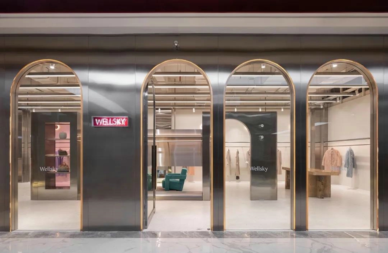 (4)門頭外觀設計。門頭的外觀在設計上要與周圍環(huán)境以及品牌調性和品類相協(xié)調。門頭外觀展現(xiàn)服裝店的檔次和個性,常用的有兩種風格分別是現(xiàn)代風和傳統(tǒng)風,通常商場里的服裝店門頭都是以現(xiàn)代風為主。在設計上要與周邊的環(huán)境互相協(xié)調融合,門頭外觀的整體風格要依據(jù)甲方品牌的調性和品類來決定,如果是比較有地域特色的服飾可以采用傳統(tǒng)風格。