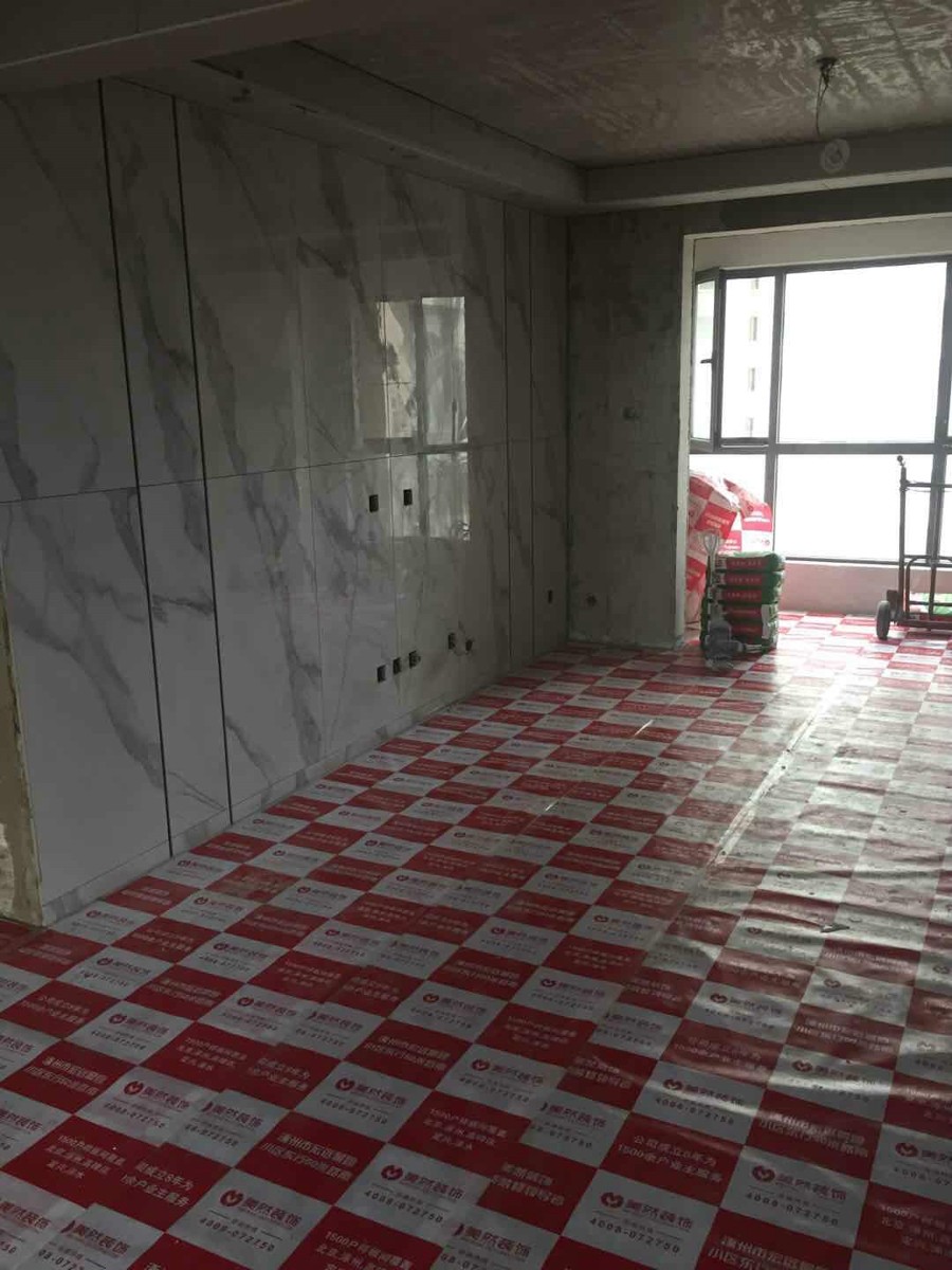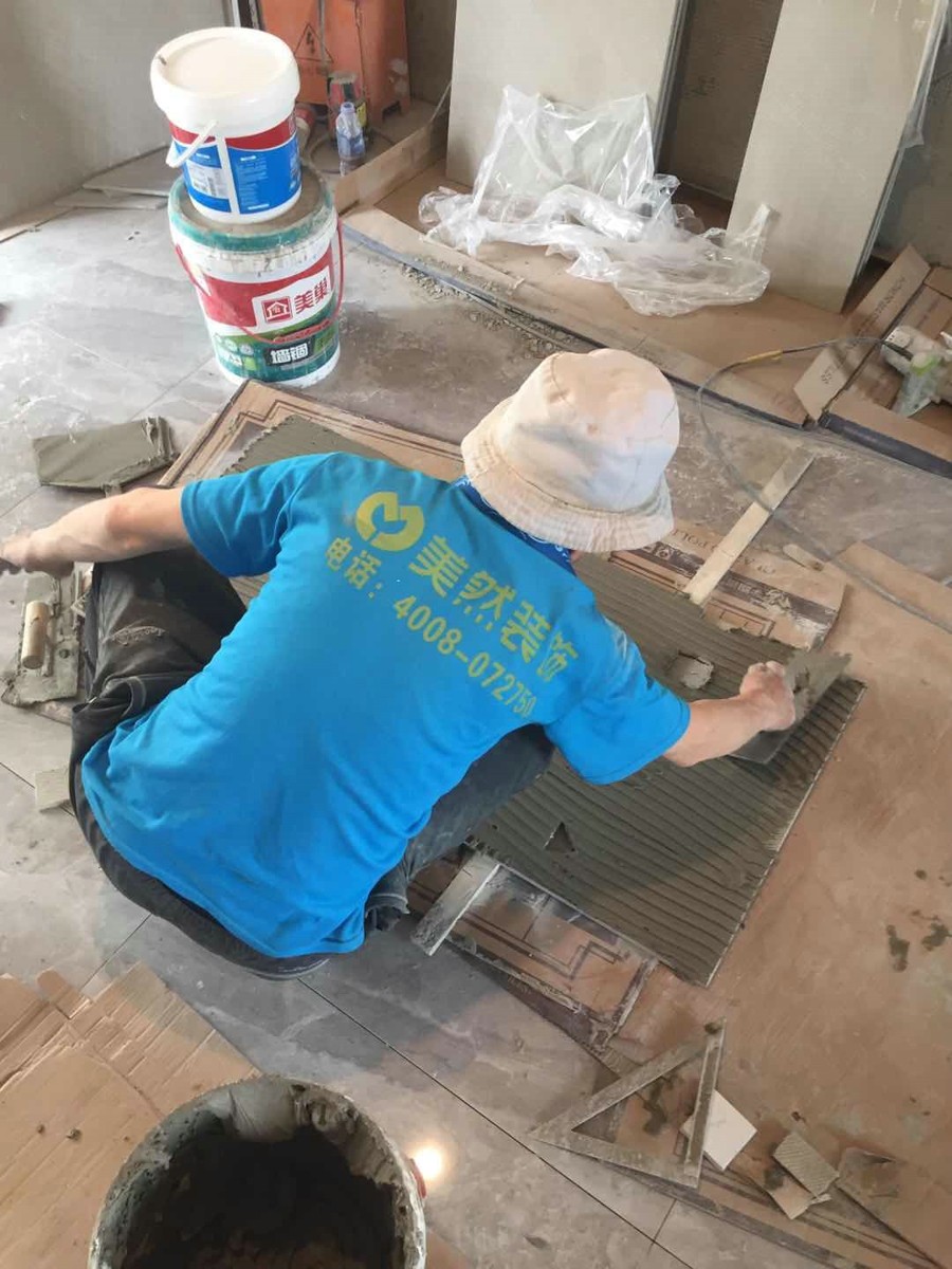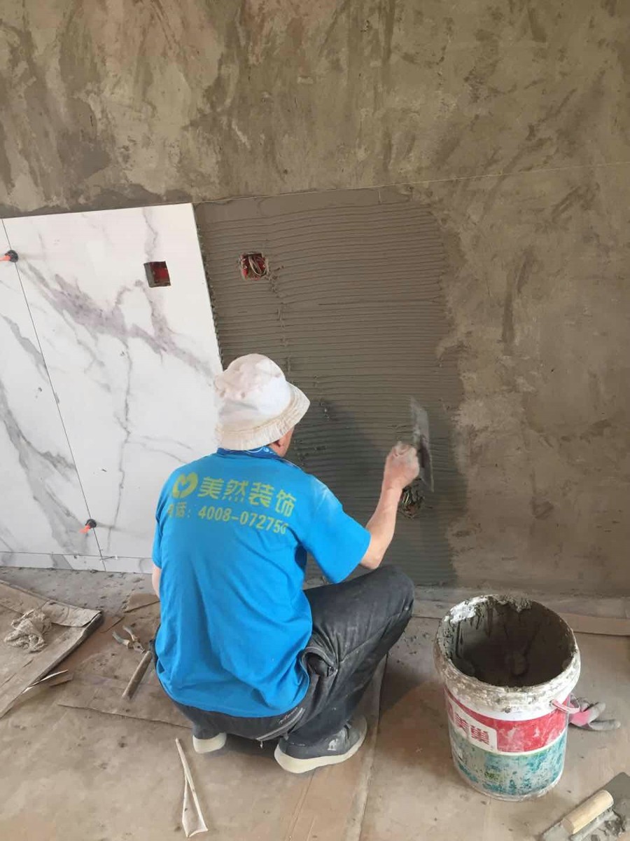 五、5月3日,今天正在進(jìn)行電視背景墻施工,干活的是李師傅,貼磚20多年了,在美然裝飾也是老工人,聽說有八年了,干活挺認(rèn)真的,手藝不錯,工程負(fù)責(zé)人說為了防止瓷磚脫落,用的是薄貼法施工,這樣比較結(jié)實。