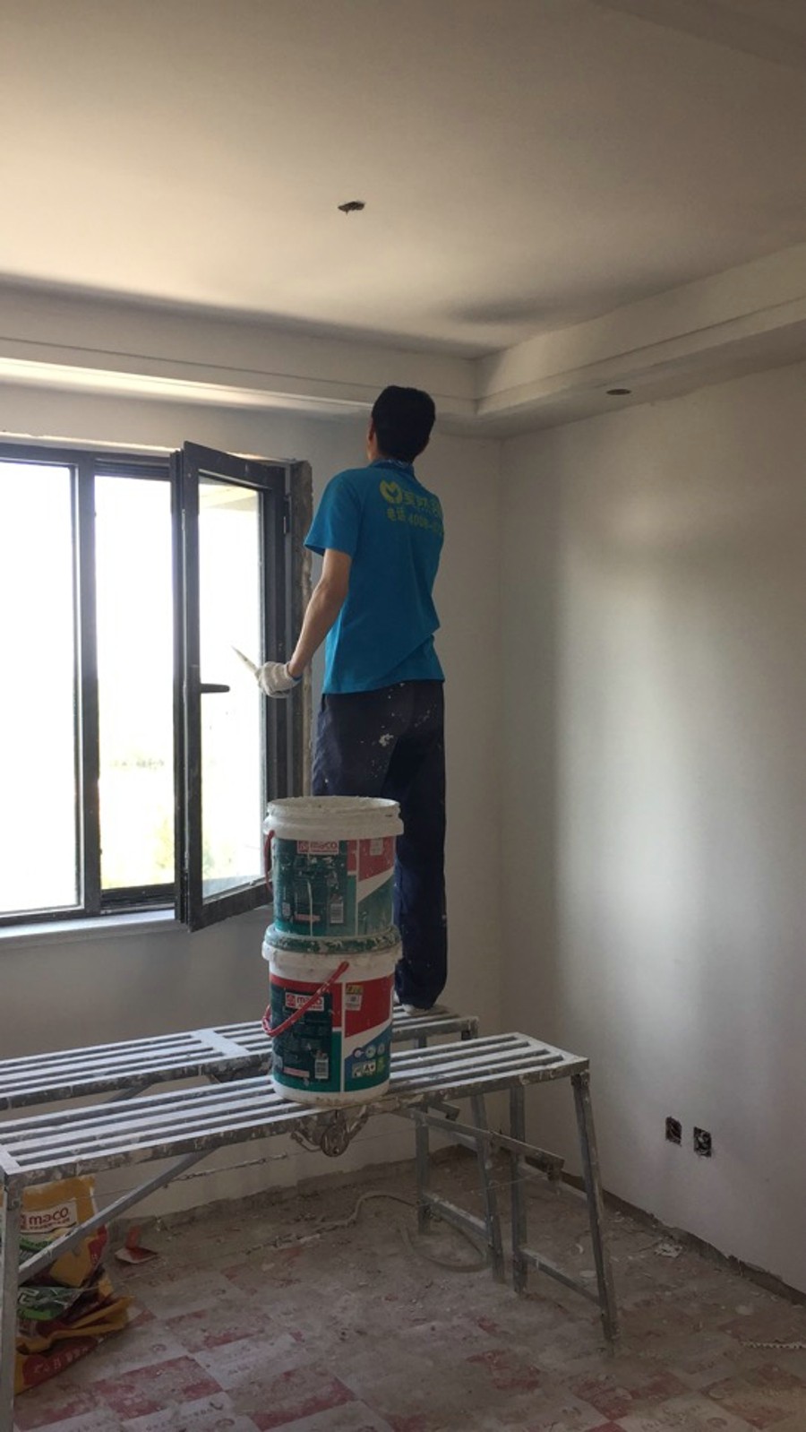 二、時間:2020年4月7日,今天來現(xiàn)場查看,工人正在鏟頂面的膩子,墻面已經(jīng)鏟干凈了,開發(fā)商刮膩子真是多此一舉,費(fèi)工費(fèi)錢。陽臺保溫也拆除了,速度很快。聽曹工說工人都是由公司直接開工資,這在涿州是獨(dú)一份。